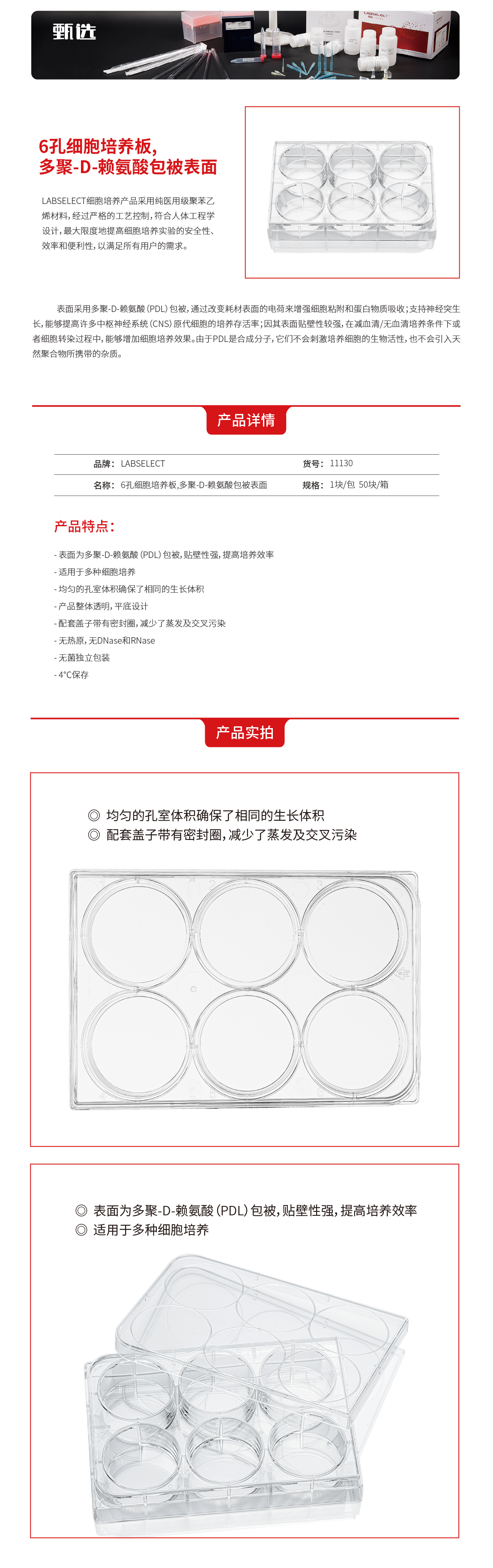 11130 6孔细胞培养板,多聚-D-赖氨酸包被表面(11130)