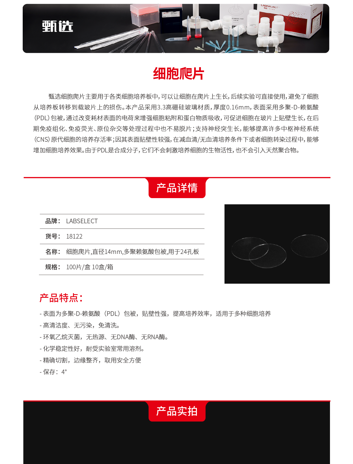 18122 细胞爬片,直径14mm,多聚赖氨酸包被,用于24孔板(18122)